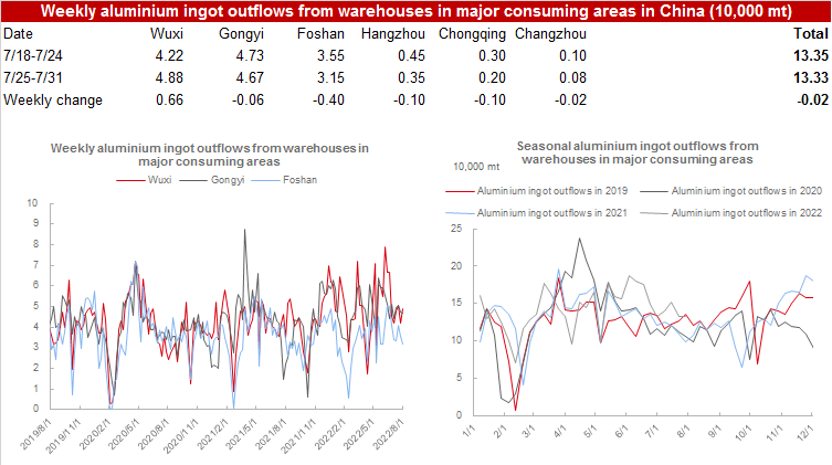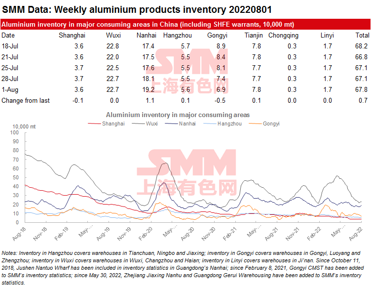 SHANGHAI, Aug 1 (SMM) - The aluminium ingot social inventories across China’s eight major markets totalled 678,000 mt as of August 1, up 7,000 mt from last Thursday, but 81,000 mt lower than in the same period last year. The inventory of aluminium ingots and billets in Foshan has been rising for two consecutive weeks due to poor trades and smooth arrivals. Wuxi and Gongyi saw limited arrivals, allowing the inventory in Gongyi to decline. Given the poor willingness to purchase, the aluminium ingot social inventories may grow further after shipments that are now on the way gradually arrive in the future.
