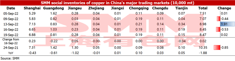 SHANGHAI, Sep 19 (SMM) - As of Monday September 19, SMM copper inventory across major Chinese markets added 200 mt from last Friday to 84,700 mt, down 5,100 mt from last Tuesday. Among them, the inventory in Shanghai rose 2,300 mt to 68,800 mt, which was reflected in the arrival of imported copper such as two Chilean brands, ILO and non-registered brands. Inventory in Guangdong dipped 2,200 mt to 8,100 mt. The output of some smelters in south China declined amid the tight supply of copper scrap, thus the arrival of domestic copper in Guangdong decreased. Besides, the inflow of imported copper was also limited. Inventory in Tianjin dropped 400 mt to 1,500 mt as the narrow spread between the copper cathode and copper scrap supported the copper cathode consumption.