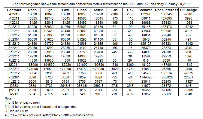 The following table shows the ferrous and nonferrous metals movement on the SHFE and DCE on Sep 20, 2022