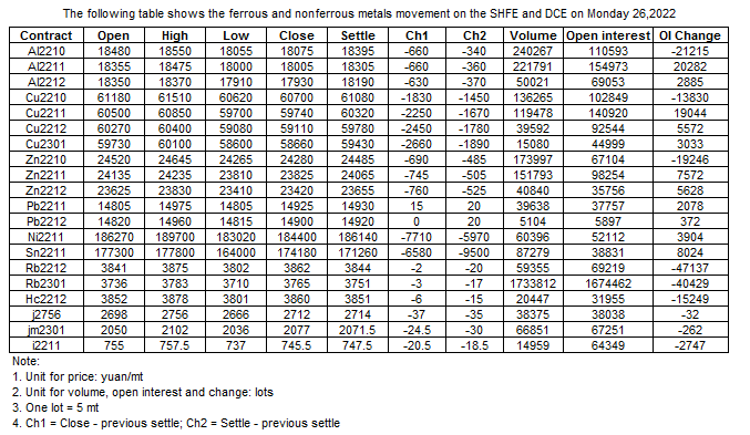 The following table shows the ferrous and nonferrous metals movement on the SHFE and DCE on Sep 26, 2022