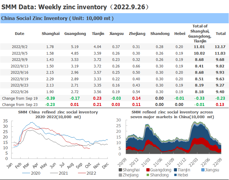 SHANGHAI, Sep 26 (SMM) - According to SMM data, the zinc ingot inventories across seven major markets in China totalled 94,000 mt as of September 26, up 1,300 mt over the weekend and down 2,300 mt on a weekly basis. In the Shanghai market, zinc ingots of Qinlin shipped directly by smelters did not arrive yet while some enterprises picked up cargoes over last weekend. Therefore, the inventory in Shanghai dropped slightly. The arrivals in the Guangdong market were stable, but the trades were fewer than those in the previous week. The downstream buyers were not enthusiastic about stocking up, and thus the inventory in south China increased slightly. The arrivals in the Tianjin market were stable over last weekend, and downstream enterprises were not willing to pick up cargoes as they had received some cargoes directly from smelters. As a result, the inventory in Tianjin continued to add. On the whole, inventories in Shanghai, Guangdong and Tianjin slipped 100 mt, and those across seven major markets in China gained 1,300 mt.