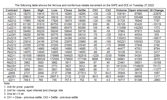 The following table shows the ferrous and nonferrous metals movement on the SHFE and DCE on Sep 27, 2022