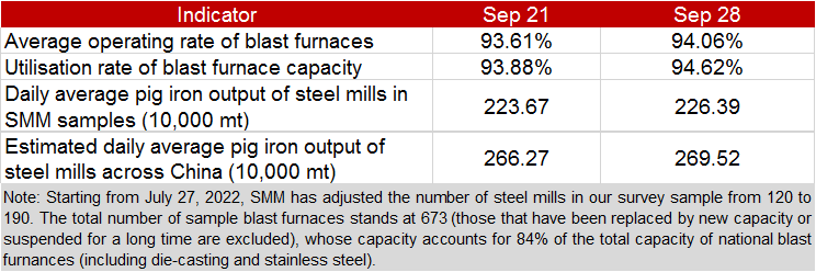 SHANGHAI, Sep 28 (SMM) - The average operating rate of blast furnaces at steel mills rose 0.45 percentage point from a week ago to 94.06% as of September 28, SMM survey showed. The utilisation rate of blast furnace capacity stood at 94.62%, up 0.74 percentage point from the previous week. The daily average pig iron output of sample steel mills rose 27,200 mt week-on-week to 2.23 million mt. The daily average pig iron output of across China is estimated at 2.70 million mt, up 32,500 mt on the week.
