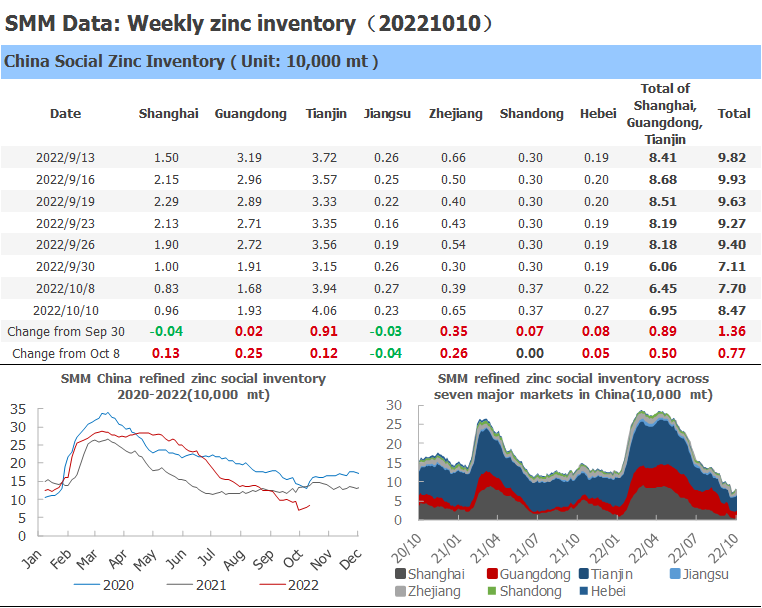 SHANGHAI, Oct 10 (SMM) - SMM data shows that zinc ingot inventories across seven major markets in China totalled 84,700 mt as of October 10, up 13,600 mt from September 30 and up 7,700 mt from last Saturday (October 8). The inventory in Shanghai only rose by 1,300 mt, which was less than expected. The statistics show that the arrivals in Shanghai during the holiday were relatively low, and there was no signs of zinc ingot inflow of Baiyin and Qinlin brands, which had been expected to arrive. At the same time, the downstream enterprises continued to pick up the goods one after another during the holiday. The inventory in Guangdong increased slightly as some of the zinc ingots were transferred to Shanghai while the local arrivals were low during the holiday. The inventory in Tianjin accumulated significantly as the smelters received stable cargoes during the holiday. However, the recent pandemic outbreak in Inner Mongolia and Xinjiang has hindered the transportation of local smelters, who still maintain normal production though. Other markets all saw slight increases in inventories, but the overall increase was little. On the whole, inventories in Shanghai, Guangdong and Tianjin rose 5,000 mt, and inventories across seven major markets in China gained 7,700 mt.
