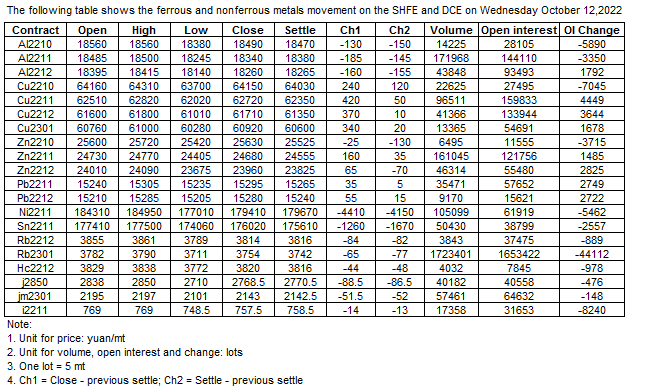 The following table shows the ferrous and nonferrous metals movement on the SHFE and DCE on Oct 12, 2022