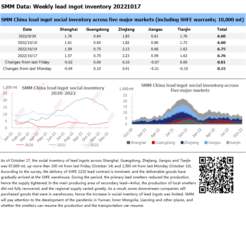 SHANGHAI, Oct 17 (SMM) - As of October 17, the social inventory of lead ingots across Shanghai, Guangdong, Zhejiang, Jiangsu and Tianjin was 67,600 mt, up more than 100 mt from last Friday (October 14) and 1,500 mt from last Monday (October 10).