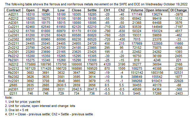 The following table shows the ferrous and nonferrous metals movement on the SHFE and DCE on Oct 19, 2022
