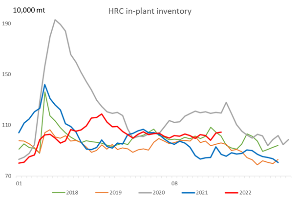 The in-plant inventory of steel makers totalled 1.04 million mt, up 5,300 mt or 0.51% on the week, and a gain of 19.98% on the year.