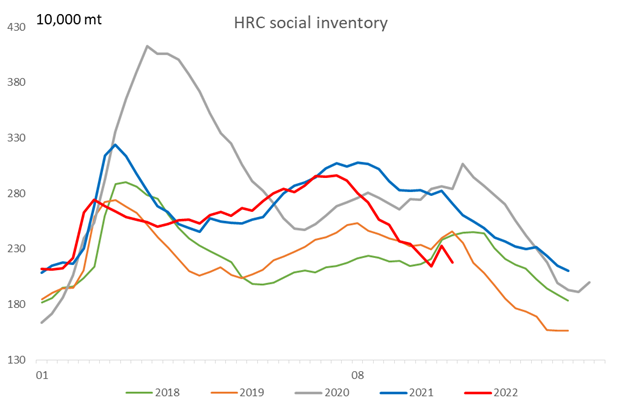 The inventory across social warehouses was 2.18 million mt, down 147,300 mt or 6.33% from the previous week, a drop of 19.61% on the year.