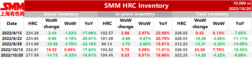 SHANGHAI, Oct 20 (SMM) – The total inventory of HRC across social warehouses and steel makers in China stood at 3.22 million mt as of October 20, down 142,000 mt or 4.22% from a week ago, a decrease of 9.99% on the year.