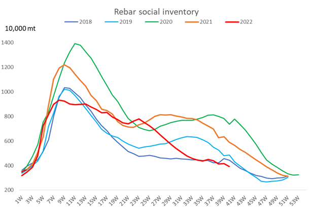 The inventory across social warehouses was 3.93 million mt, down 220,200 mt or 5.31% on the week, and a drop of 33.4% on the year.