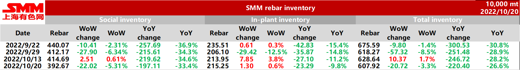 SHANGHAI, Oct 20 (SMM) – The total inventory of rebar across social warehouses and steel makers in China stood at 6.08 million mt as of Thursday October 20, down 207,200 mt or 3.3% from a week ago, and down 26.6% from the same period last year.
