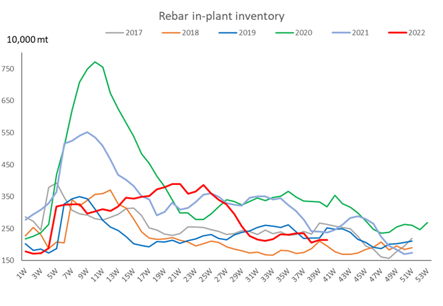The in-plant inventory stood at 2.15 million mt, up 18,000 mt or 0.6% on the week, and down 9.8% on the year.