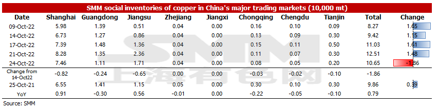 SHANGHAI, Oct 24 (SMM) - As of Monday October 24, SMM copper inventory across major Chinese markets stood at 106,500 mt, down 18,600 mt from last Friday but up 7,900 mt from the same period last year when the data was 98,600 mt. The inventory in all regions of China decreased. In detail, the inventory in Shanghai decreased 8,200 mt to 74,600 mt, the inventory in Guangdong dropped 2,400 mt to 11,100 mt, the inventory in Jiangsu dipped 6,500 mt to 17,100 mt, the inventory in Tianjin fell 1,000 mt to 2,000 mt, and the inventory in Chengdu and Chongqing fell slightly.