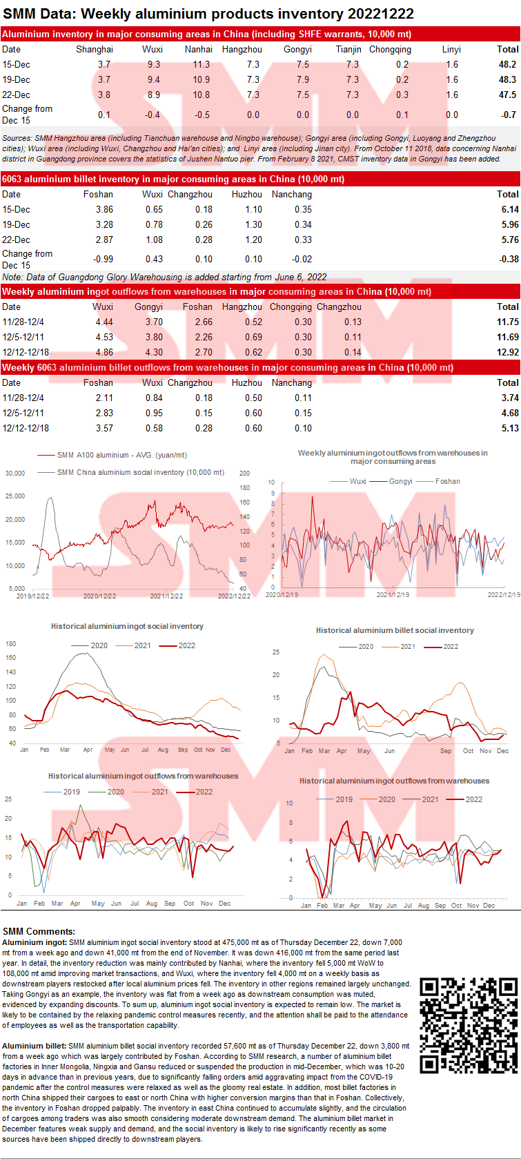 Aluminium billet: SMM aluminium billet social inventory recorded 57,600 mt as of Thursday December 22, down 3,800 mt from a week ago which was largely contributed by Foshan. According to SMM research, a number of aluminium billet factories in Inner Mongolia, Ningxia and Gansu reduced or suspended the production in mid-December, which was 10-20 days in advance than in previous years, due to significantly falling orders amid aggravating impact from the COVID-19 pandemic after the control measures were relaxed as well as the gloomy real estate. In addition, most billet factories in north China shipped their cargoes to east or north China with higher conversion margins than that in Foshan. Collectively, the inventory in Foshan dropped palpably. The inventory in east China continued to accumulate slightly, and the circulation of cargoes among traders was also smooth considering moderate downstream demand. The aluminium billet market in December features weak supply and demand, and the social inventory is likely to rise significantly recently as some sources have been shipped directly to downstream players.