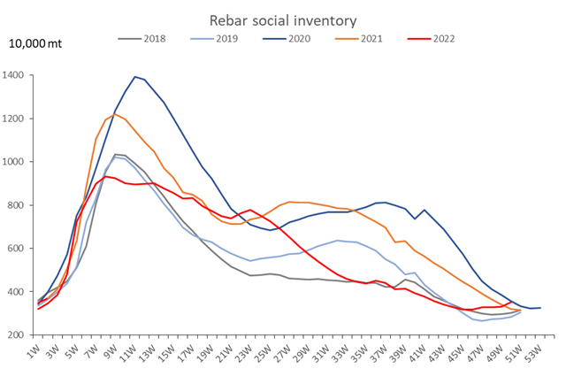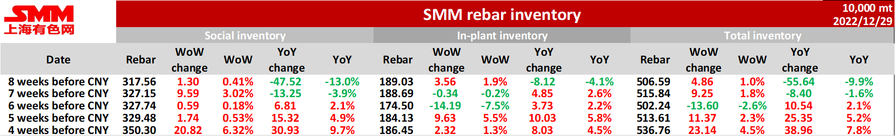 SHANGHAI, Dec 29 (SMM) – The total inventory of rebar across social warehouses and steel makers in China stood at 5.37 million mt as of Thursday December 29, up 231,400 mt or 4.5% from a week ago, and up 7.8% from the same period last year.