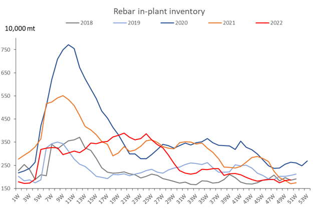 The in-plant inventory stood at 1.86 million mt, up 23,200 mt or 1.3% on the week, and up 4.5% on the year.