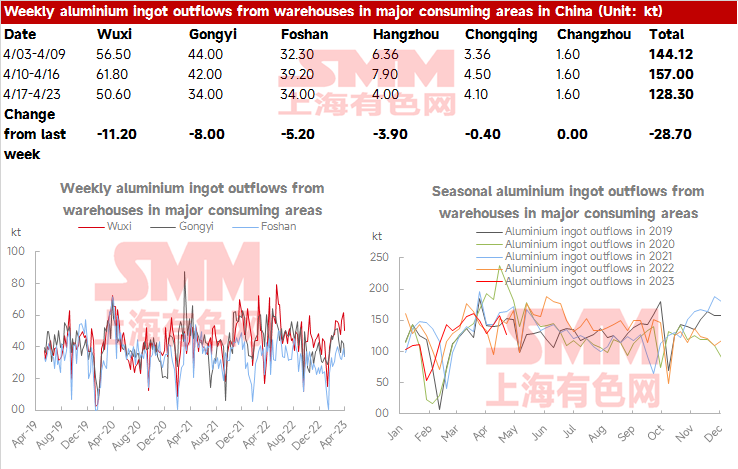 Aluminium ingot outflows from social warehouses in major markets declined 28,700 mt week-on-week to 128,300 mt in the week ending April 23.
