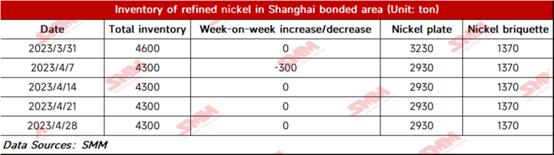 SHANGHAI, Apr 28 (SMM) - As of April 28, bonded zone inventory of nickel stood flat WoW at 4,300 mt. The inventory of nickel briquettes was 1,370 mt, and that of nickel plates was 2,930 mt. SHFE/LME nickel price ratio fell, and the import window remained closed. Some spots were stilled shipped to domestic market as some traders locked in the price ratio, greatly easing the supply tightness of pure nickel in China.