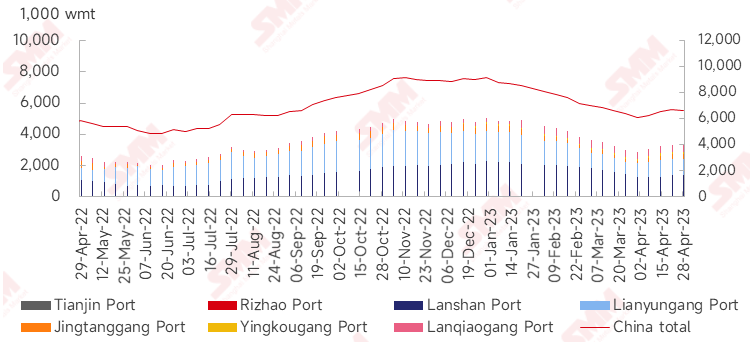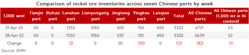 SHANGHAI, Apr 28 (SMM) - As of April 28, the nickel ore inventories at Chinese ports dropped 82,000 wmt from a week earlier to 6.64 million wmt. The total Ni content stood at 52,000 mt. The port inventory of nickel ore across seven major Chinese ports stood at 3.32 million wmt, down 12,000 wmt WoW. The prices of nickel ore rose slightly this week based on the improvement in the downstream companies’ buying interest and the mines’ intention to raise their quotes. Mines in the Philippine will ship spot ore gradually in May. Therefore, the port inventory may maintain an upward track in the near future.