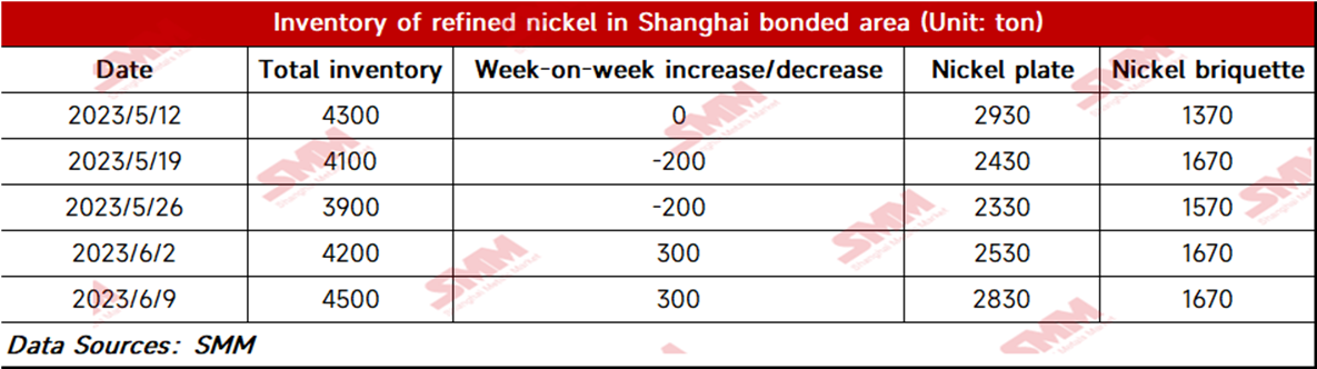 SHANGHAI, Jun 9 (SMM) - As of June 9, bonded zone inventory of nickel added 300 mt to 4,500 mt, with the inventory of nickel briquettes and nickel plates of 1,670 mt and 2,830 mt respectively. The growing inventory was contributed by the arrivals of some imported spots at ports. The nickel bonded zone inventory will rise further since the spot imports are expected to grow.