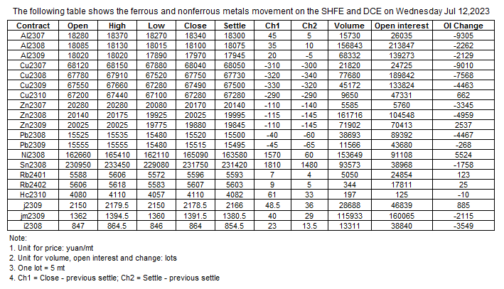 The following table shows the ferrous and nonferrous metals movement on the SHFE and DCE on Jul 12, 2023