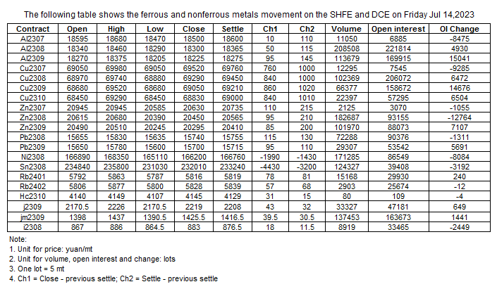 The following table shows the ferrous and nonferrous metals movement on the SHFE and DCE on Jul 14, 2023