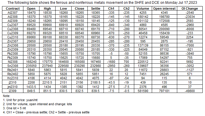 The following table shows the ferrous and nonferrous metals movement on the SHFE and DCE on Jul 17, 2023