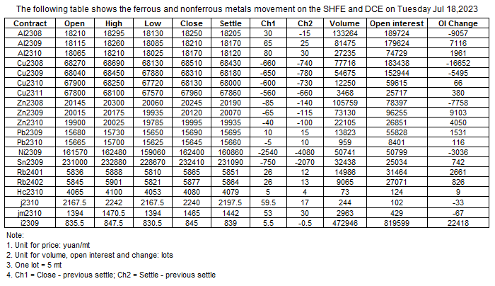 The following table shows the ferrous and nonferrous metals movement on the SHFE and DCE on Jul 18, 2023
