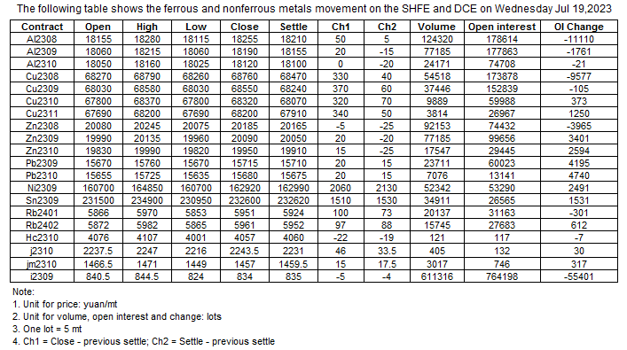 The following table shows the ferrous and nonferrous metals movement on the SHFE and DCE on Jul 19, 2023