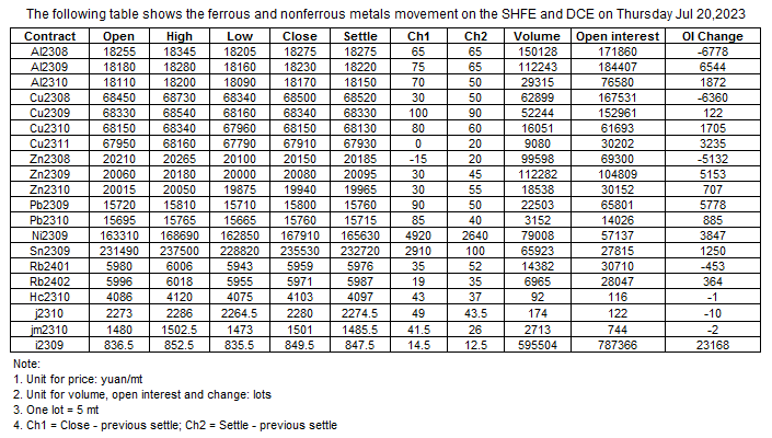 The following table shows the ferrous and nonferrous metals movement on the SHFE and DCE on Jul 20, 2023