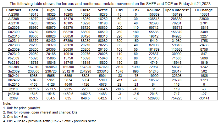 The following table shows the ferrous and nonferrous metals movement on the SHFE and DCE on Jul 21, 2023