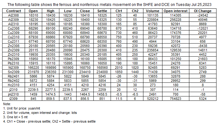 The following table shows the ferrous and nonferrous metals movement on the SHFE and DCE on Jul 25, 2023