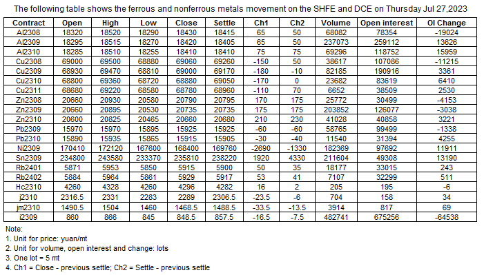 The following table shows the ferrous and nonferrous metals movement on the SHFE and DCE on Jul 27, 2023