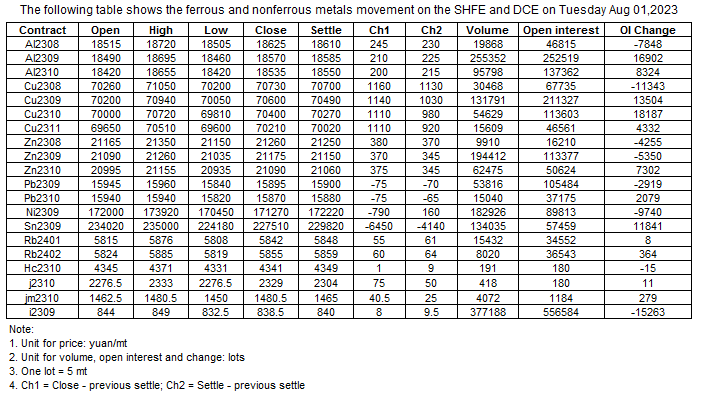 The following table shows the ferrous and nonferrous metals movement on the SHFE and DCE on Aug 01, 2023