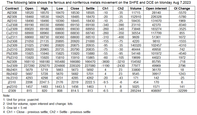 The following table shows the ferrous and nonferrous metals movement on the SHFE and DCE on Aug 7, 2023