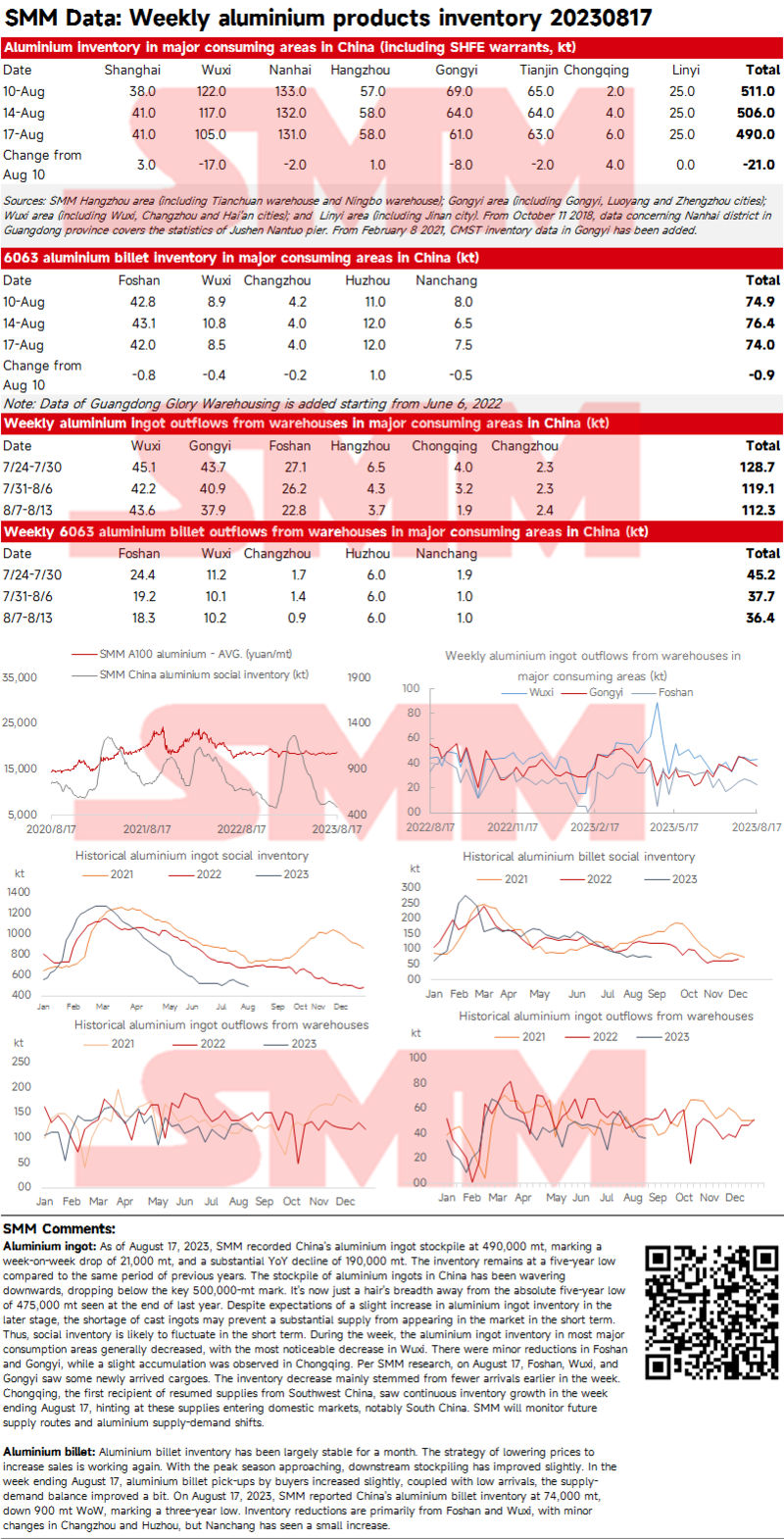 SHANGHAI, Aug 18 (SMM) – As of August 17, 2023, SMM recorded China's aluminium ingot stockpile at 490,000 mt, marking a week-on-week drop of 21,000 mt, and a substantial YoY decline of 190,000 mt. The inventory remains at a five-year low compared to the same period of previous years. The stockpile of aluminium ingots in China has been wavering downwards, dropping below the key 500,000-mt mark. It's now just a hair's breadth away from the absolute five-year low of 475,000 mt seen at the end of last year. Despite expectations of a slight increase in aluminium ingot inventory in the later stage, the shortage of cast ingots may prevent a substantial supply from appearing in the market in the short term. Thus, social inventory is likely to fluctuate in the short term. During the week, the aluminium ingot inventory in most major consumption areas generally decreased, with the most noticeable decrease in Wuxi. There were minor reductions in Foshan and Gongyi, while a slight accumulation was observed in Chongqing. Per SMM research, on August 17, Foshan, Wuxi, and Gongyi saw some newly arrived cargoes. The inventory decrease mainly stemmed from fewer arrivals earlier in the week. Chongqing, the first recipient of resumed supplies from Southwest China, saw continuous inventory growth in the week ending August 17, hinting at these supplies entering domestic markets, notably South China. SMM will monitor future supply routes and aluminium supply-demand shifts.
