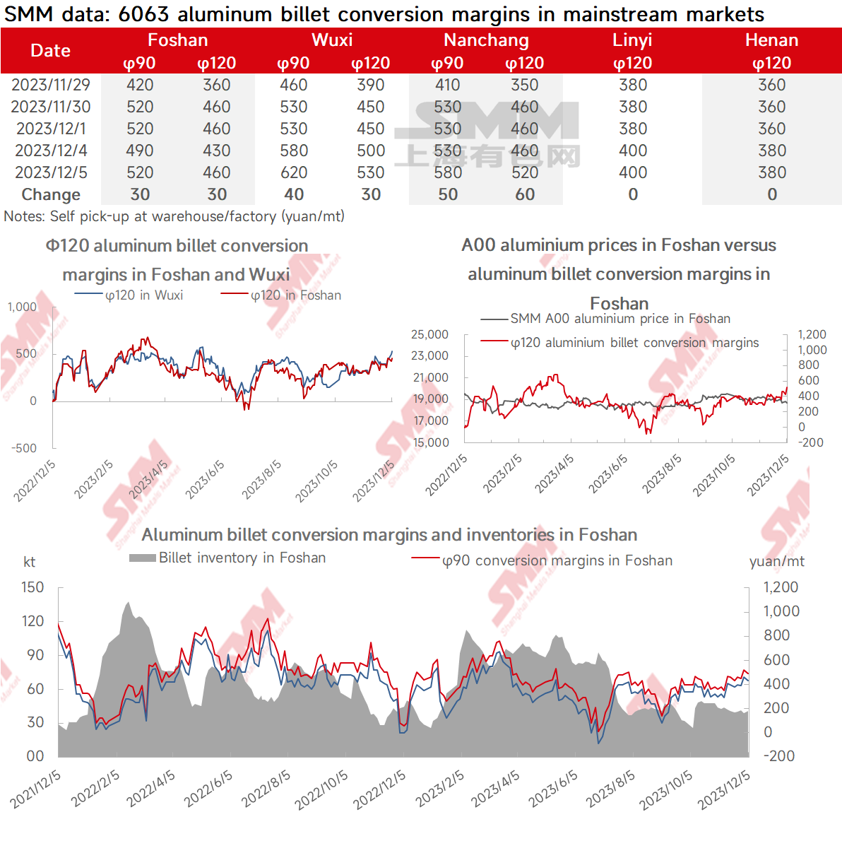 SMM data: 6063 aluminum billet conversion margins in mainstream markets