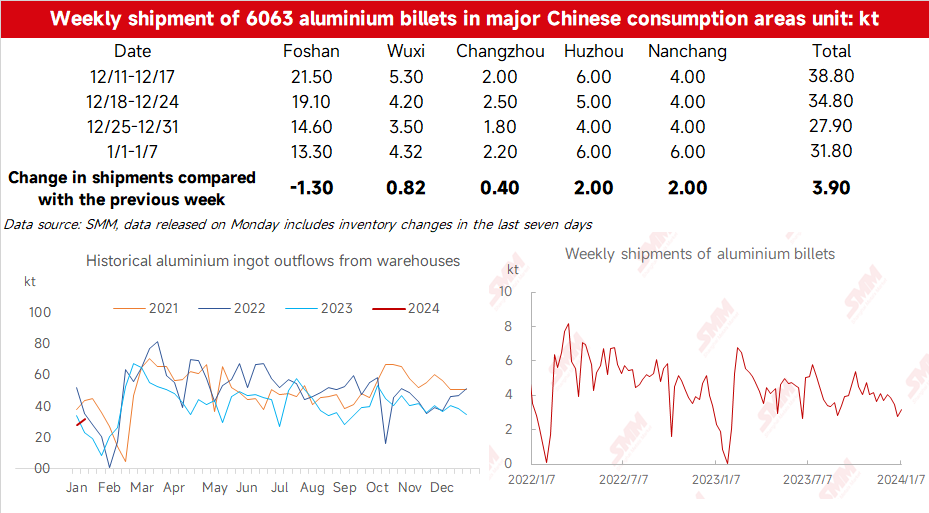 Weekly shipment of 6063 aluminium billets in major Chinese consumption areas unit: kt