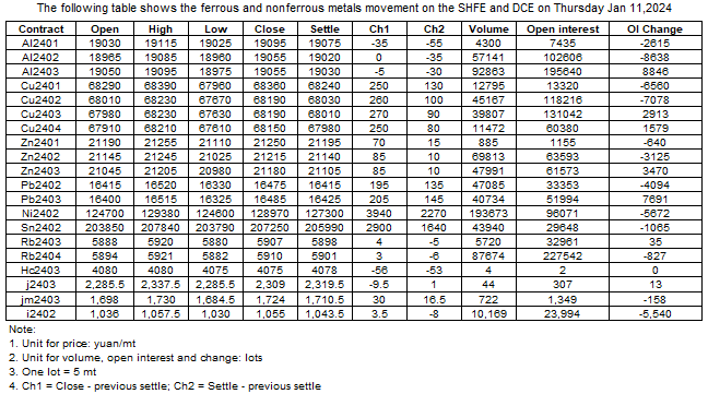 The following table shows the ferrous and nonferrous metals movement on the SHFE and DCE on Jan 11, 2024