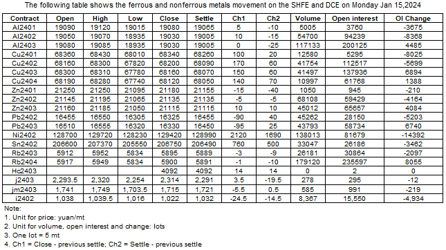 The following table shows the ferrous and nonferrous metals movement on the SHFE and DCE on Jan 15, 2024