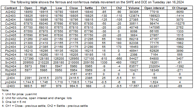 The following table shows the ferrous and nonferrous metals movement on the SHFE and DCE on Jan 16, 2024