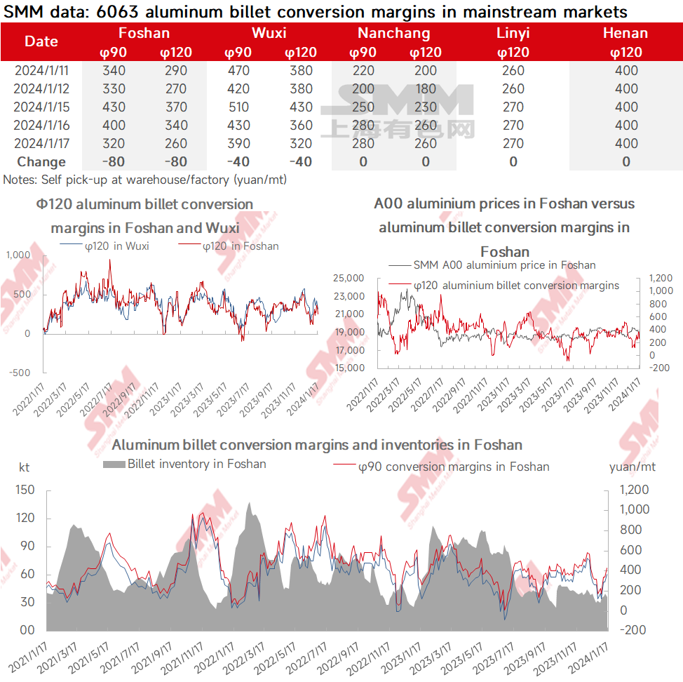 SMM data: 6063 aluminum billet conversion margins in mainstream markets