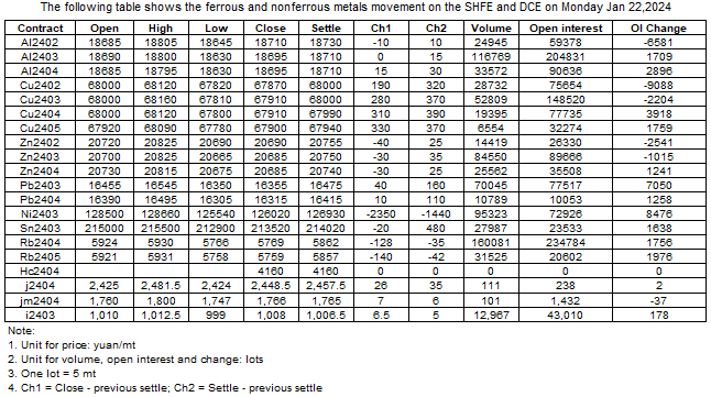 The following table shows the ferrous and nonferrous metals movement on the SHFE and DCE on Jan 22, 2024