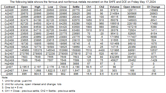 The following table shows the ferrous and nonferrous metals movement on the SHFE and DCE on May 17, 2024