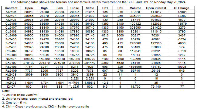 The following table shows the ferrous and nonferrous metals movement on the SHFE and DCE on May 20, 2024