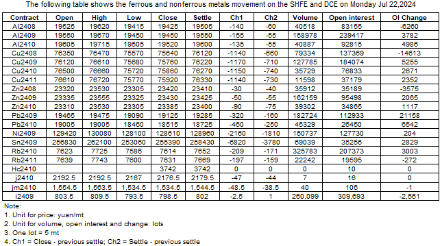 The following table shows the ferrous and nonferrous metals movement on the SHFE and DCE on Jul 22, 2024