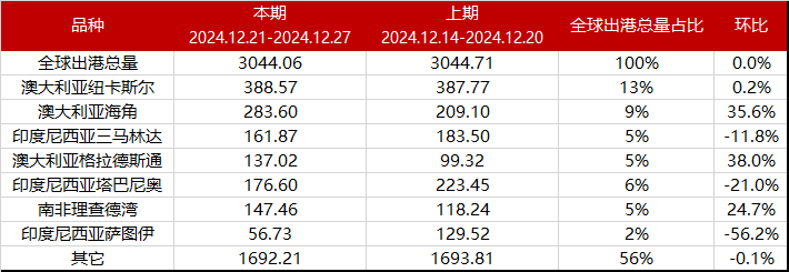 SMMGlobal total coal departures reached 3,044.0610,000 mt, down 0.0% MoM. Among them, the total departures at 7main ports were 1,351.910,000 mt, up 0.1% MoM. Departures at Newcastle Port, Australia, totaled 388.5710,000 mt, accounting for 13% of total departures, up 0.2% MoM.