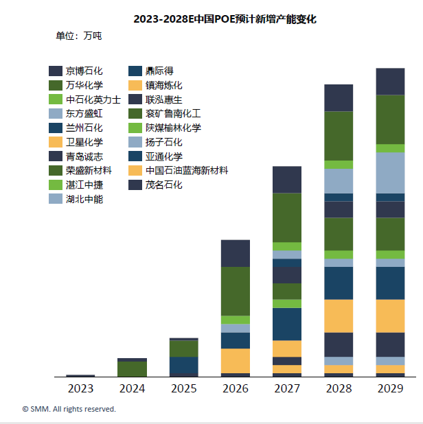 In 1991, ExxonMobil first used Exxpol technology to produce polyolefin elastomers (POE), naming the product EXACT. In 1993, Dow Chemical launched ENGAGE POE. Subsequently, Mitsui Chemicals, LG Chem, and SK-SABIC introduced their respective POE products in 2003, 2009, and 2014. In 2013, Borealis acquired ExxonMobil's plant in the Netherlands, gaining POE production capacity. By mid-2023, the global POE capacity was approximately 2 million mt, with ethylene elastomer capacity accounting for about 1.58 million mt. Due to the shared production lines of POE and other polyethylene products, the actual capacity is lower than the nominal capacity, with Dow Chemical holding a 48% market share.