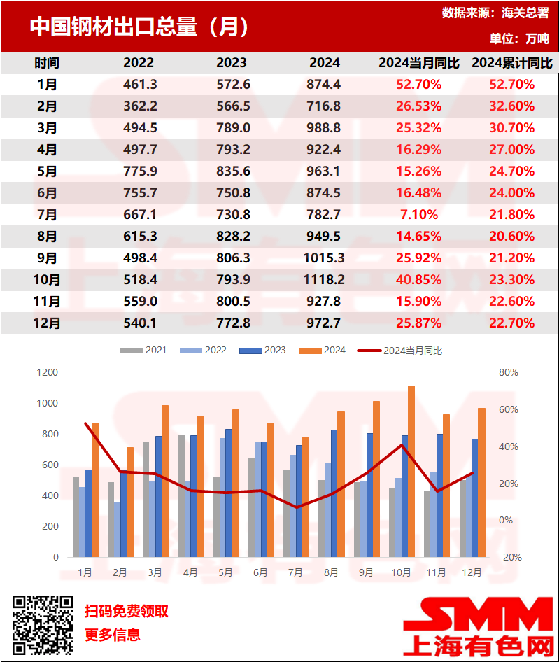On January 13, according to data from the General Administration of Customs, China exported 9.727 million mt of steel in December 2024, up 4.8% MoM and up 25.87% YoY. From January to December, steel exports totaled 110.716 million mt, up 22.7% YoY.